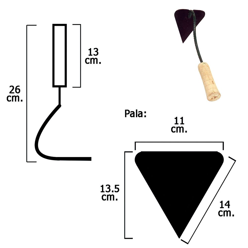 Almocafre artesano mediano. – Mango de madera.– Mediano.– Realizado en acero. – Medidas: > Mango: 13 cm.> Altura: 23 cm.> Pala: 11×13.5 cm.