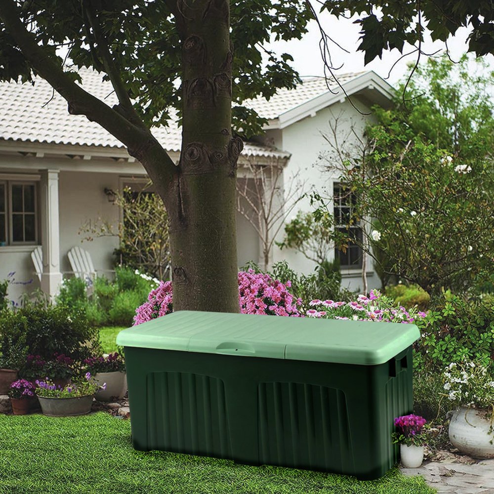 Baul resina. – Baúl multiuso. – Medidas: 125x57x56 (alt) cm. – Color verde con tapa en color verde más claro. – Resistente a las bajas temperaturas, para interiores y exteriores.