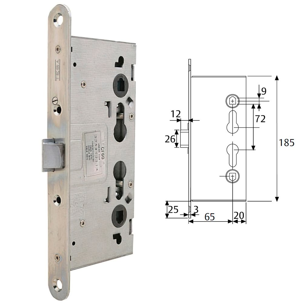 Cerradura Tesa antipanico cf60 /65 mm. – Certificada según norma une-en 12209: 2004. – Cerradura cf60 sin cilindro, antipánico en todos los modelos. – Entrada de 65 mm. – Distancia entre ejes de 72 mm. – Reversible – Función condena – Picaporte.