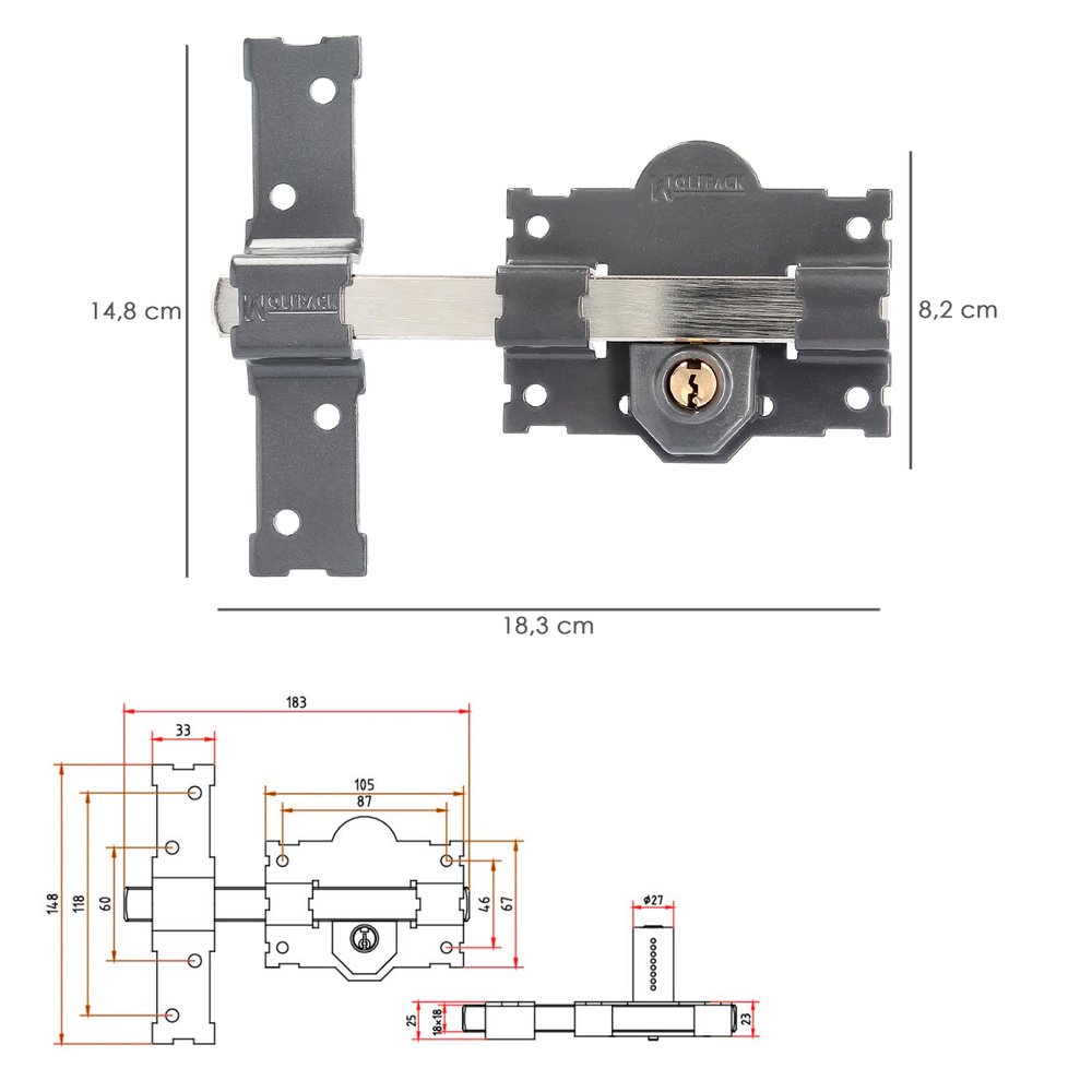 Cerrojo Wolfpack b-4. – Cerrojo con llave ambos lados. – Pasador de 183 mm. realizado en acero. – Valido para apertura a izquierda y a derecha. – Cilindro de 70 mm. – Llave compatible para copiar Fac-14D.