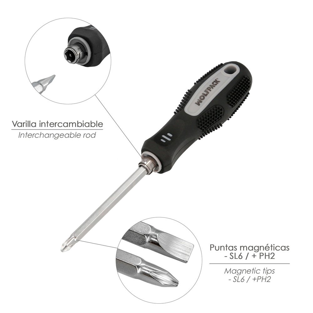 Destornillador intercambiable.– Longitud: 150 mm.– Mango bimaterial.– Ideal para trabajos industriales.– Fabricacion bajo norma DIN-ISO.