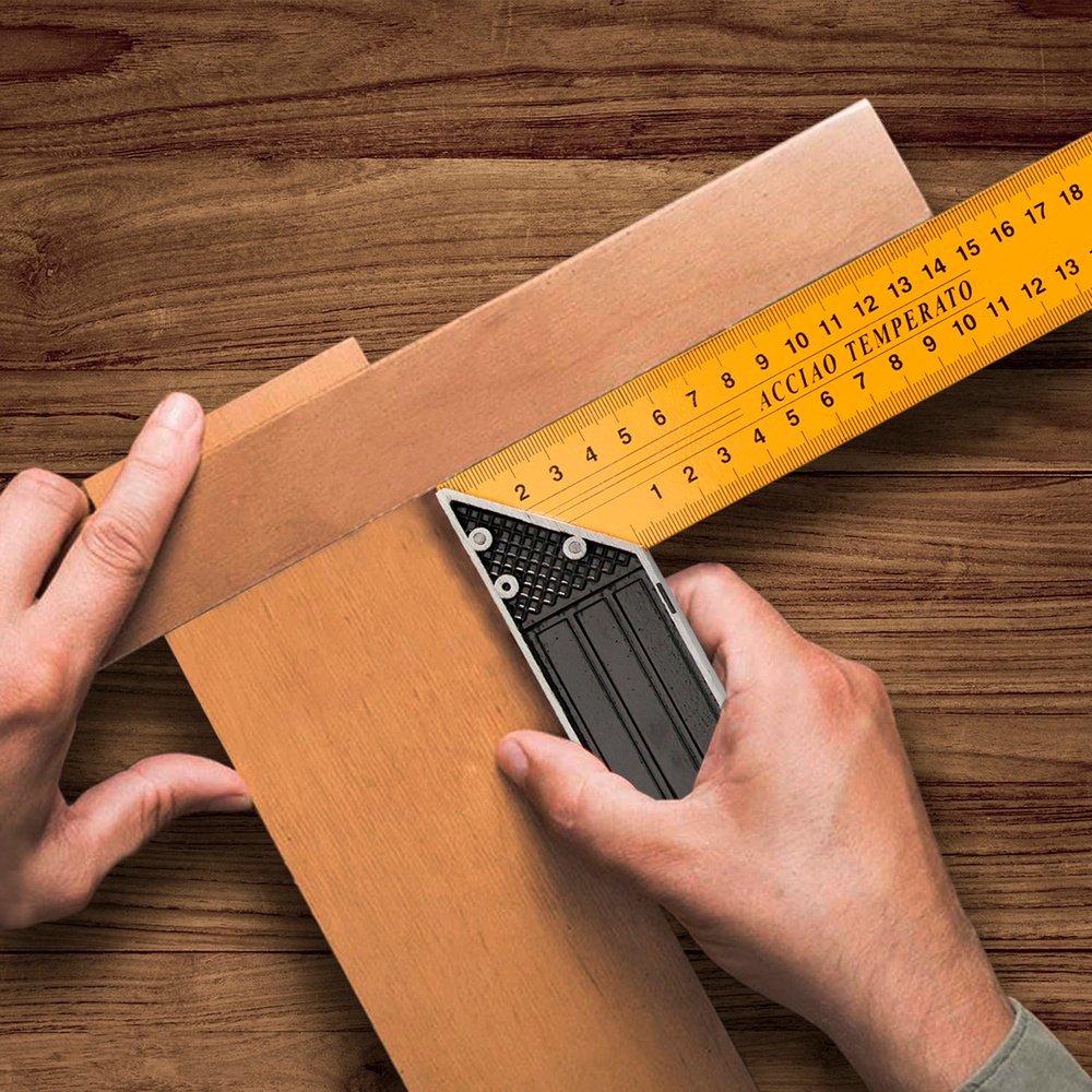 Escuadra metalica. – Medida: 300 mm. – Regla realizada en acero. – Mango de aluminio. – Puede señalizar angulos de 90º y 45º – Ideal para trabajos de construcción, carpinteria.
