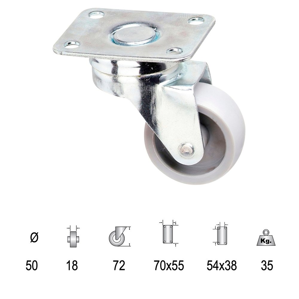 Rueda plástico con pletina. – Diámetro: 35 mm. – Ancho rueda: 18 mm. – Tamaño pletina: 70×55 mm. – Carga máxima soportada: 35 Kg. – Realizada en polyamida.